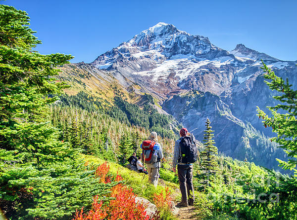 Several Hikers/Backpackers admiring the view of Mt. Hood from the trail to McNeil Point on the slope of Mt. Hood.