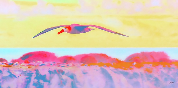 An albatross gracefully flies over a colorful and abstract seascape, with hues of pink, blue, and yellow blending together. The sky and ocean create... more