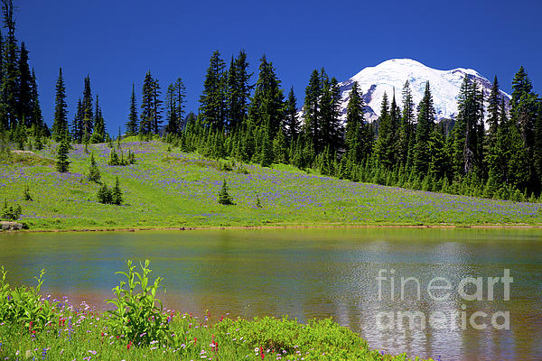 Summer day near Mt. Rainer in Mt. Rainier National Park with a meadow and an Alpine Lake.