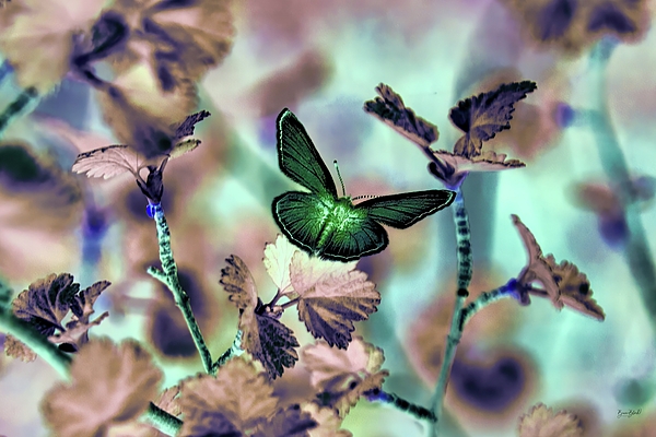 A vibrant butterfly with bright green wings is perched among stylized, inverted-color foliage. The background features soft pastel hues that create a... more