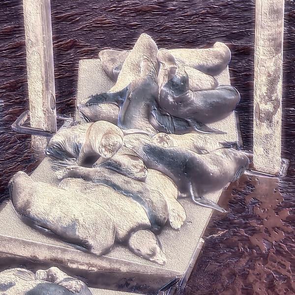 Seals are lounging in a group on a wooden platform, surrounded by water. The scene captures a serene moment as the animals rest together in what... more