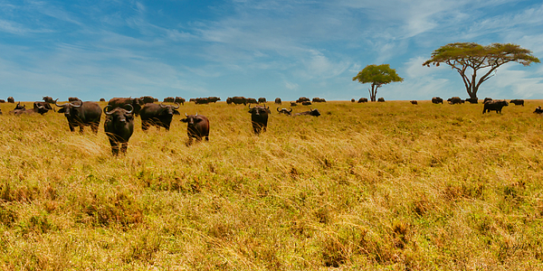 A herd of cape buffalo in the Serengeti plains of Tanzania.