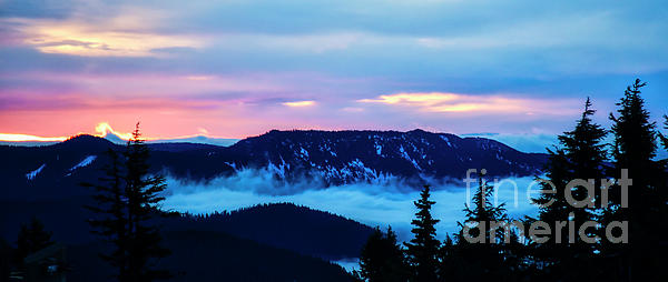 Fog in the valley and a fiery sunrise in winter from Mt. Hood in the Oregon Cascade Mts.