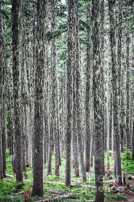 A forrest on the slopes of Mount hood in Oregon. Trees are covered in old man's beard except at the base where the deer can eat it.