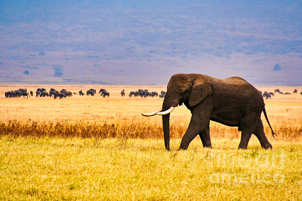 Large bull elephant walking though Ngorongoro Crater in Tanzania Africa. Wildebeest in the background