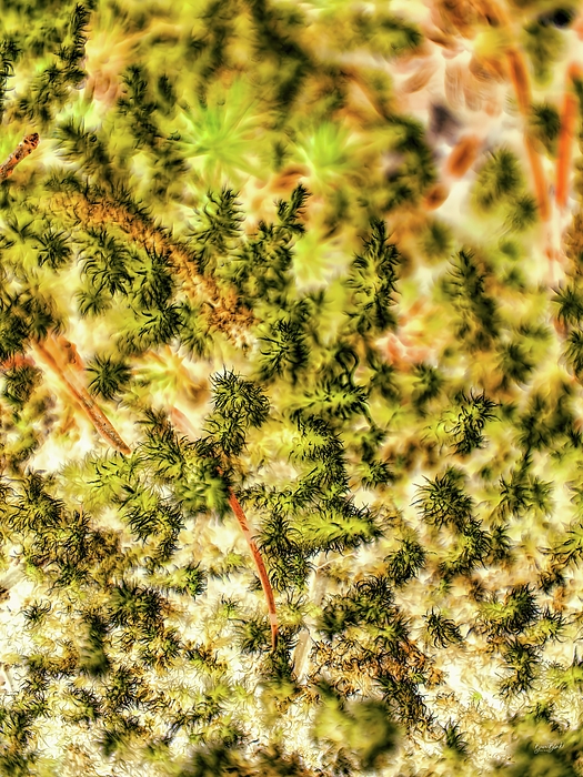Lush green foliage appears densely packed, creating an intricate pattern with vibrant shades of green and hints of earthy brown tones. The scene conveys a sense of depth and natural beauty, as if viewed through a hazy or dreamlike lens.
