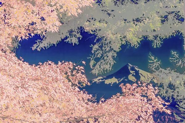 Delicate pastel tones frame a serene landscape with a mountain in the background, viewed through foliage. The inverted colors give a dreamlike... more