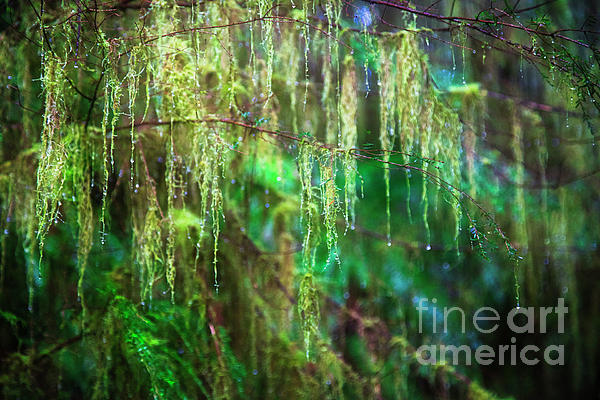 old man's beard or usnea hanging on tree branches in the rain in the pacific northwest coastal range mountains near the oregon coast.
