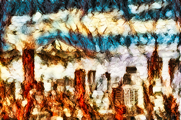 Portland OR with Mt. Hood the background - as the fog is clearing - with a bark texture