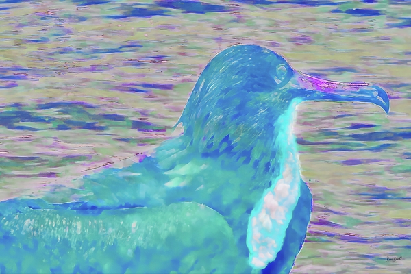 A bird with vibrant blue tones stands out against a multicolored, abstract background. The depiction highlights its detailed plumage and distinctive silhouette.
