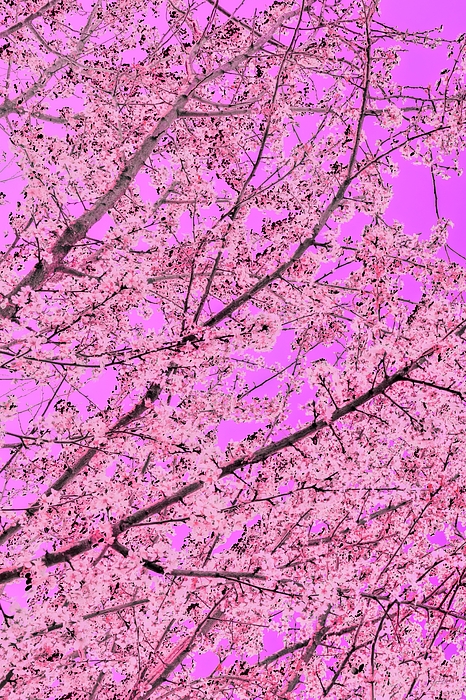 Branches filled with pink blossoms stretch across a surreal magenta backdrop, creating a vivid and unusual display of nature. The color palette is... more