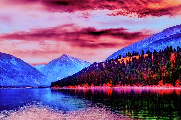 Vivid colors dominate the breathtaking landscape, featuring a serene lake reflecting a vibrantly hued sky. Tall pine forests line the shore, with... more