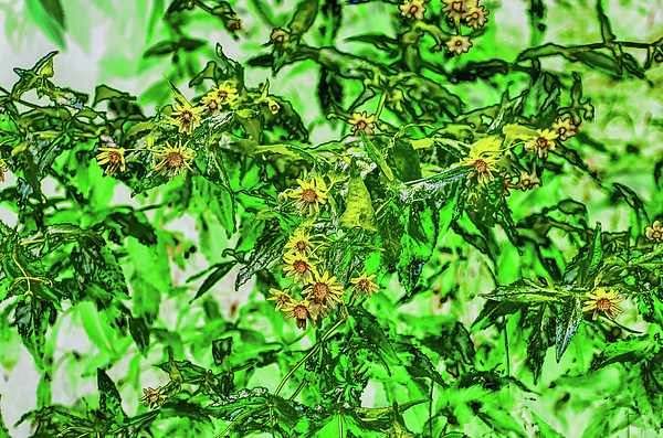 A densely packed scene of green foliage and small yellow flowers is presented with a highly stylized, possibly digitally manipulated appearance. The... more